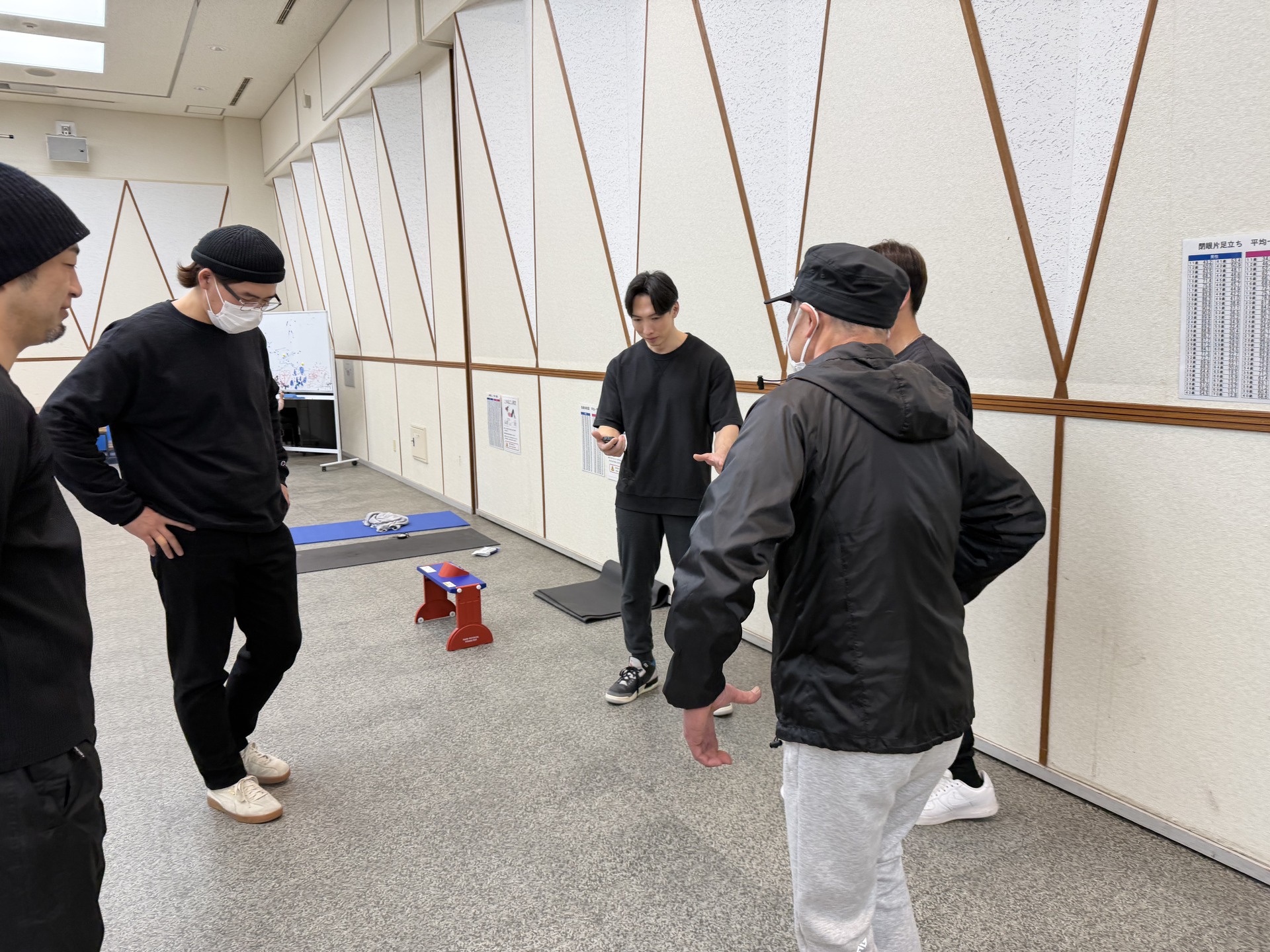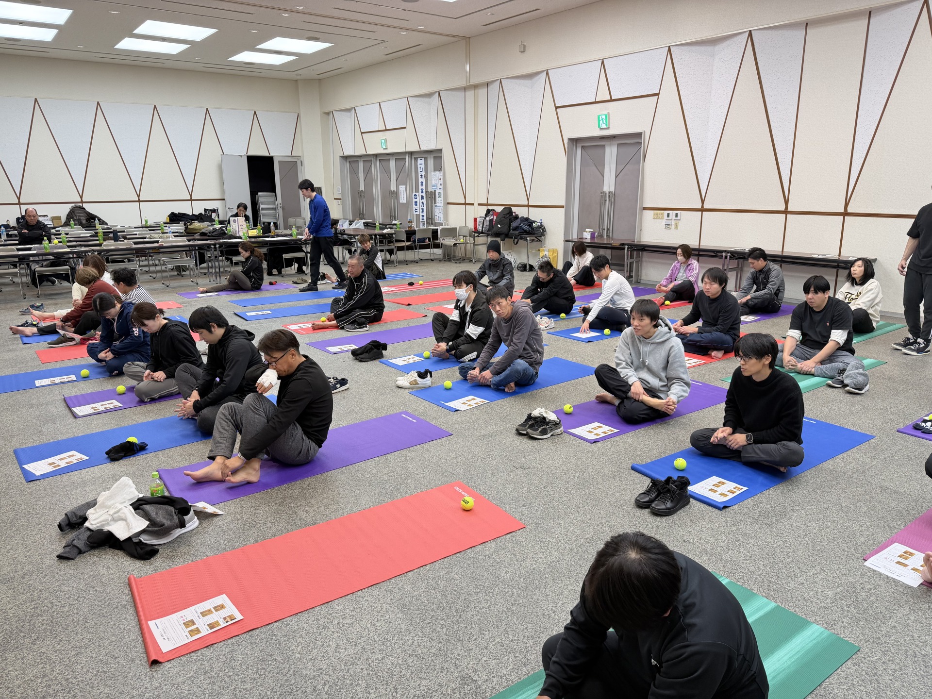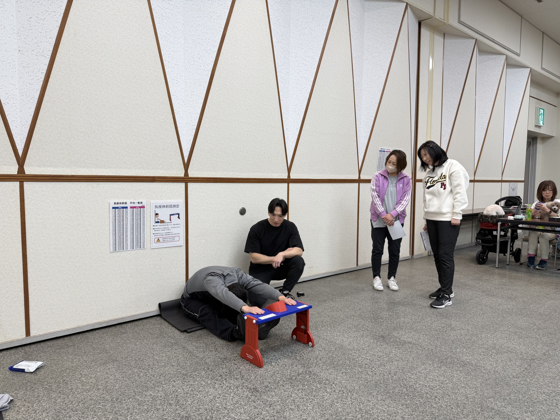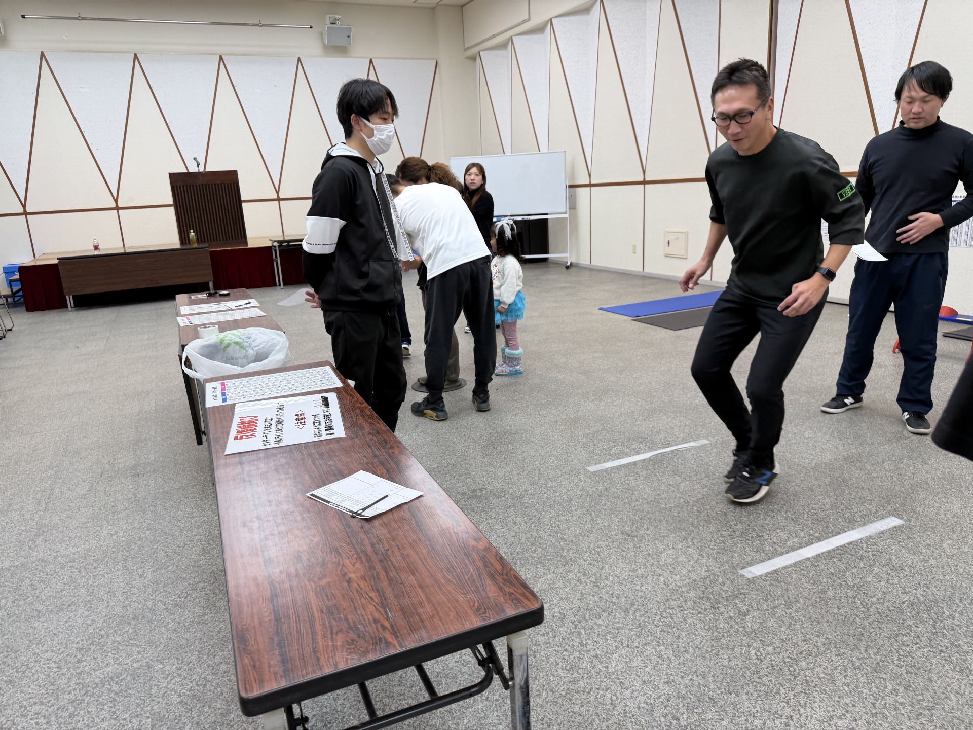 午前の部では握力、長座体前屈、上体起こし、閉眼片足立ち、反復横跳び、垂直飛びの6種目と立位年齢測定、
